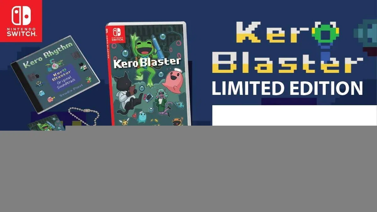 - Kero Blaster – Limited Edition includes the Original Soundtrack CD, an acrylic keychain, a logo sticker, the Kero Blaster employee handbook, and a numbered authenticity card!