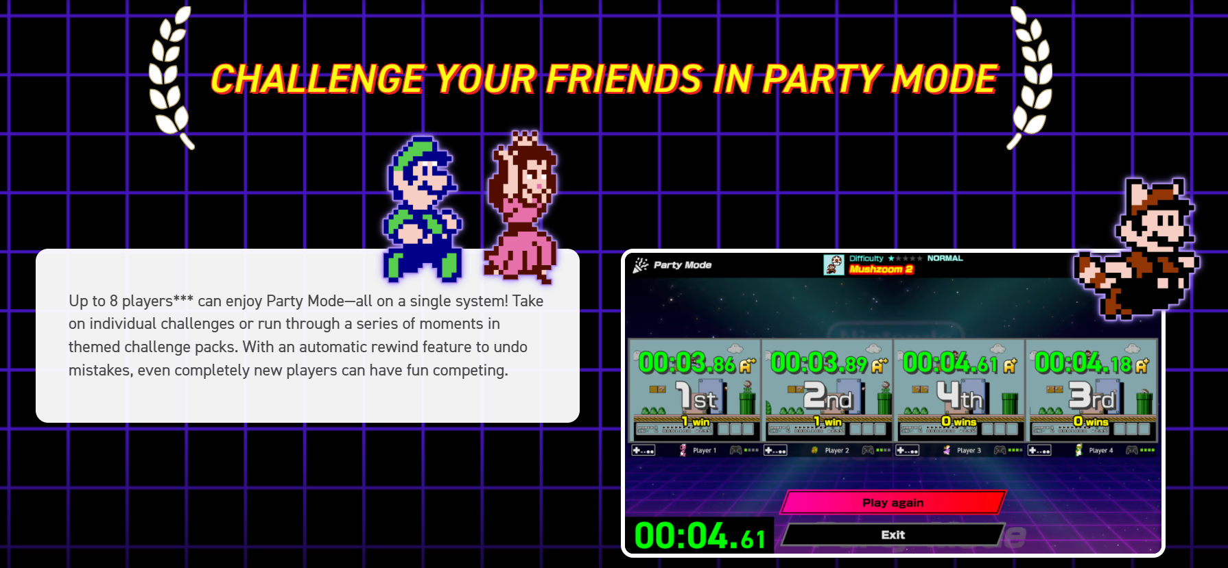 Relive memorable moments with big and small challenges across 13 classic NES games*. You don't need to master entire games to feel like a Nintendo World Champion. And don’t worry if you’ve never played a millisecond of the original games—newcomers are welcome!