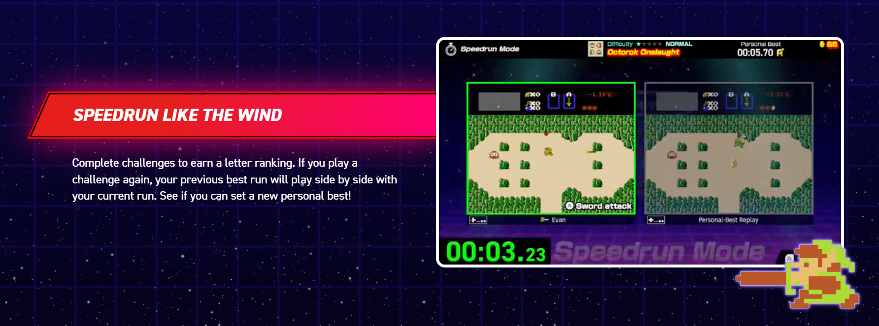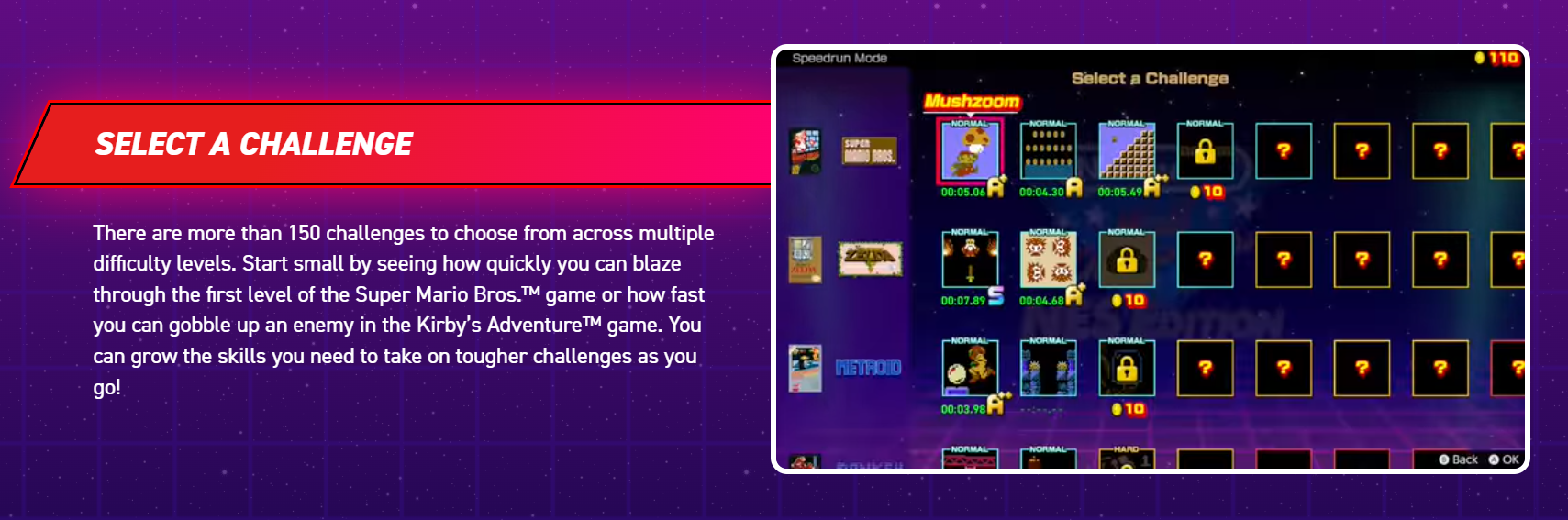 When you feel ready, take on longer and more difficult Legend Challenges! Speed your way through Super Mario Bros. using Warp Zones, the entire first dungeon of the Legend of Zelda™ game, and more in the ultimate tests. Check out the Classified Information for tips and tricks if you need a little help!